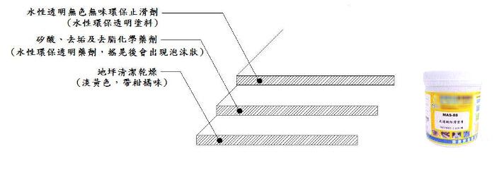 本公司產品採用高科技高效能環保止滑劑配方,應用超微米技術,以一定的力量與速度塗抹於磁磚或石材表面,利用石材毛細孔,製造數以千萬計超微米凹洞,應用真空吸盤原理,當地板潮濕、磁磚受壓時,吸力就會增加,達到磁磚、石材防滑止滑的效果。